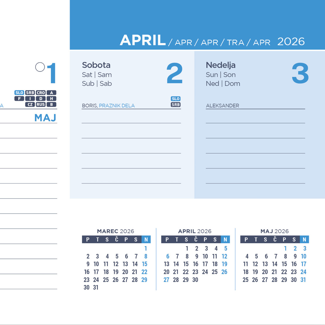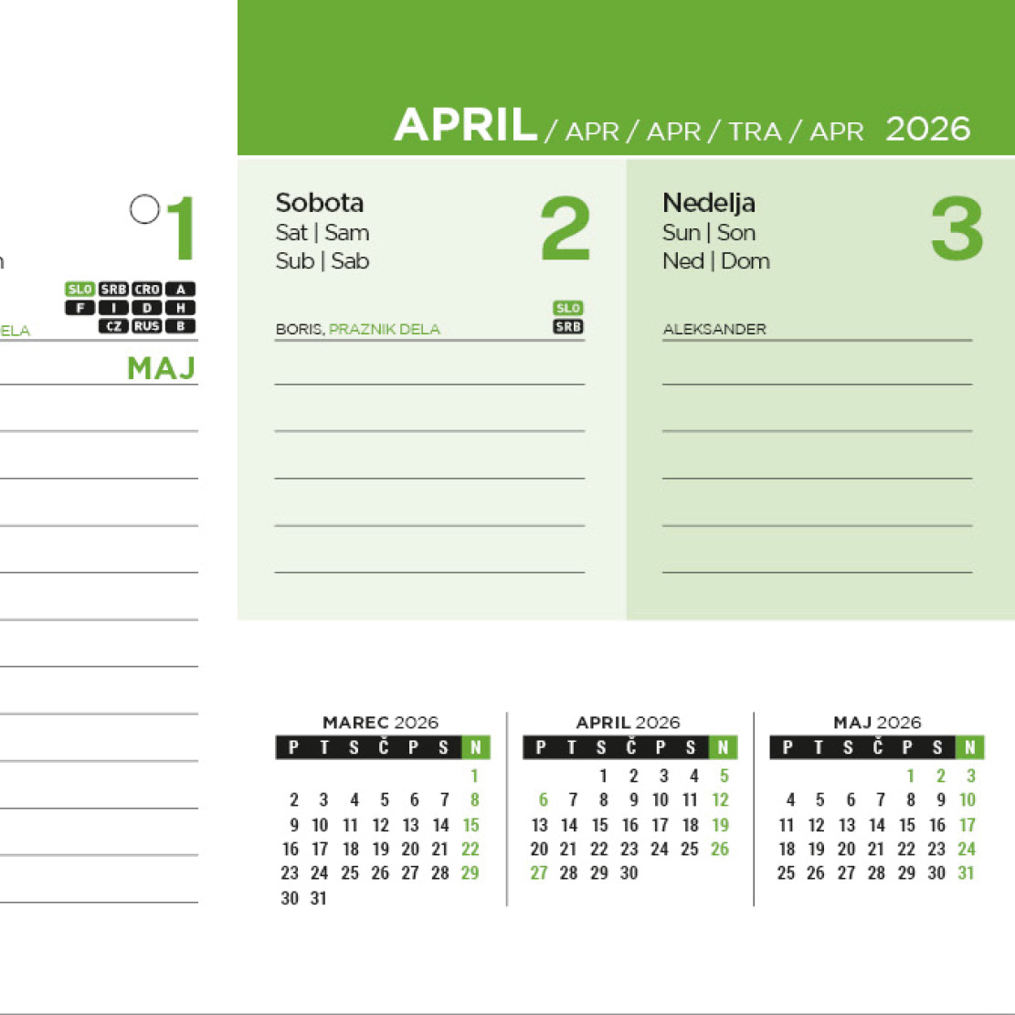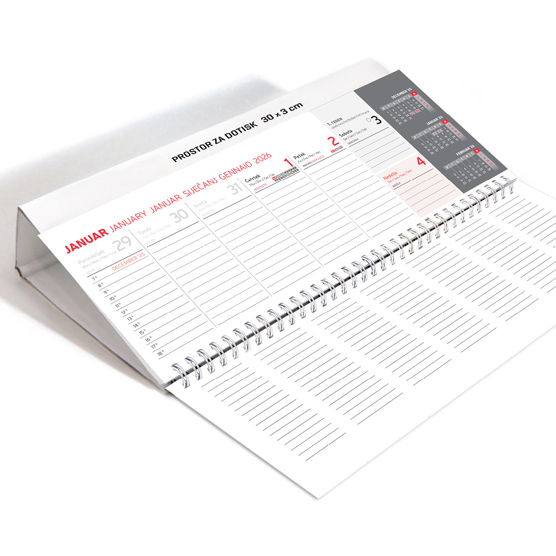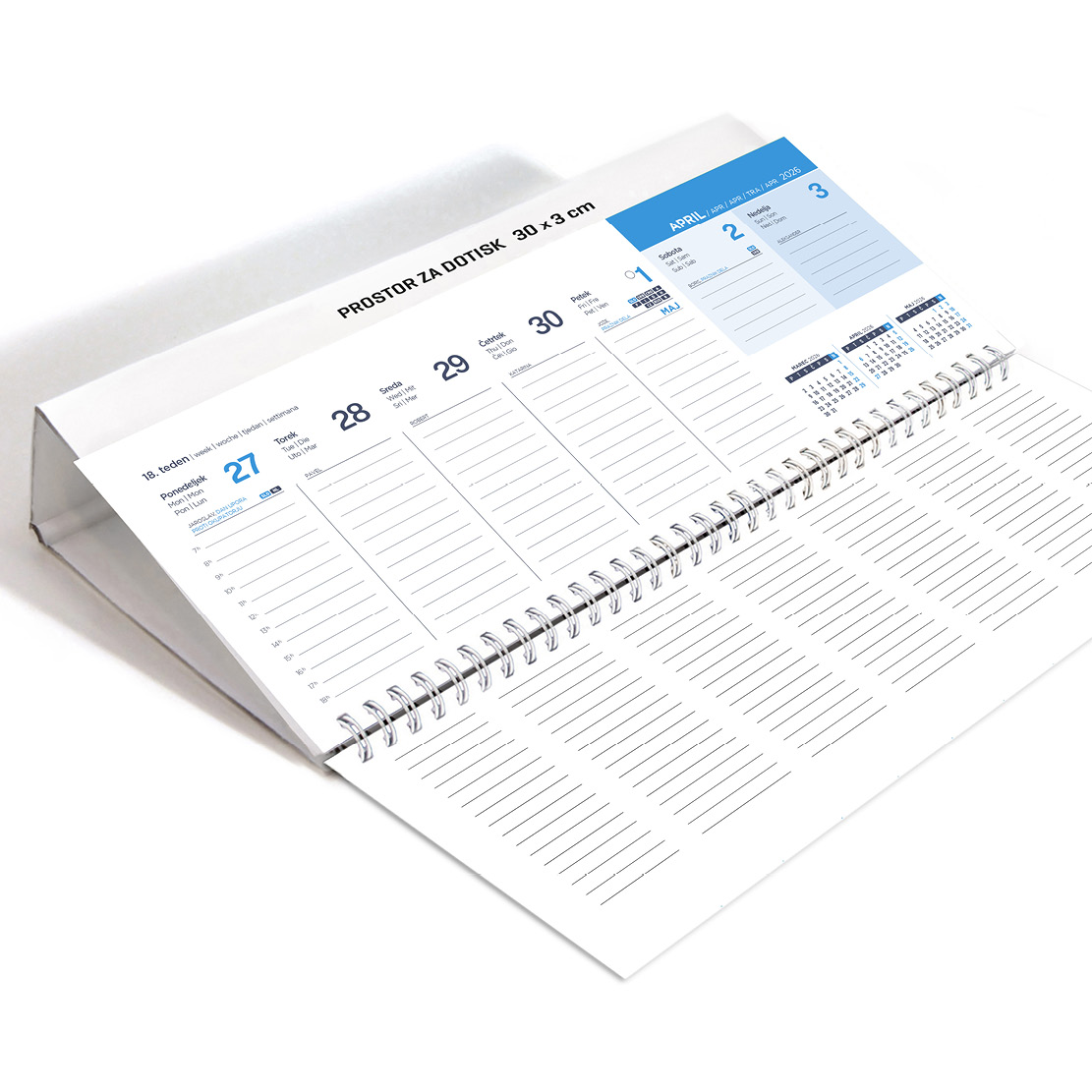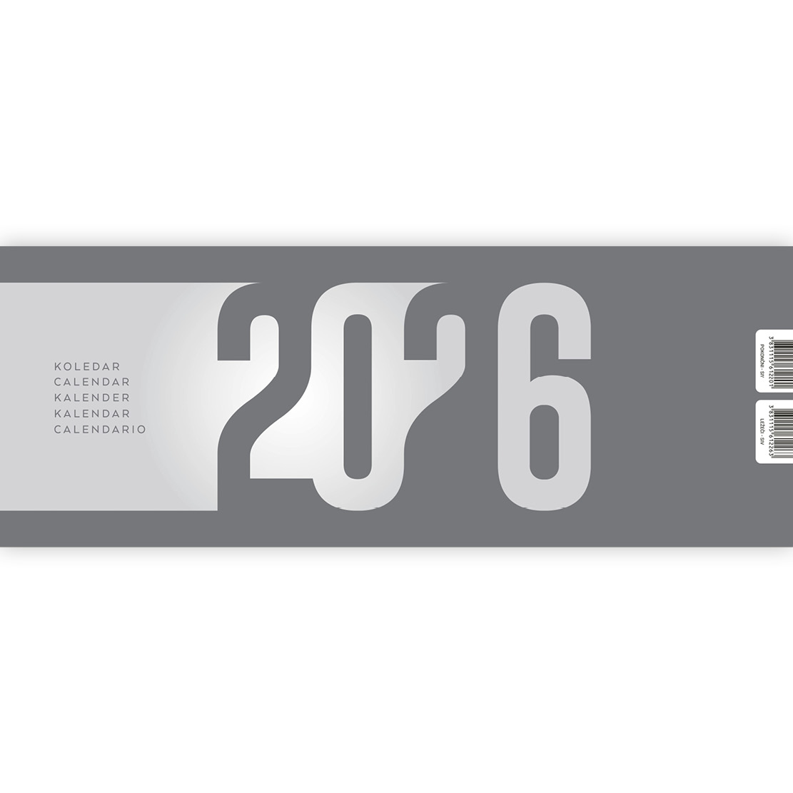 56 listov, stojalo iz lepenke (fiksno), 90g brezlesni papir, spiralna vezava, priložena natron vrečka, petjezični (SLO, ANG, NEM, HR, ITA), označeni slov. in tuji prazniki, imena, lune in tedni.