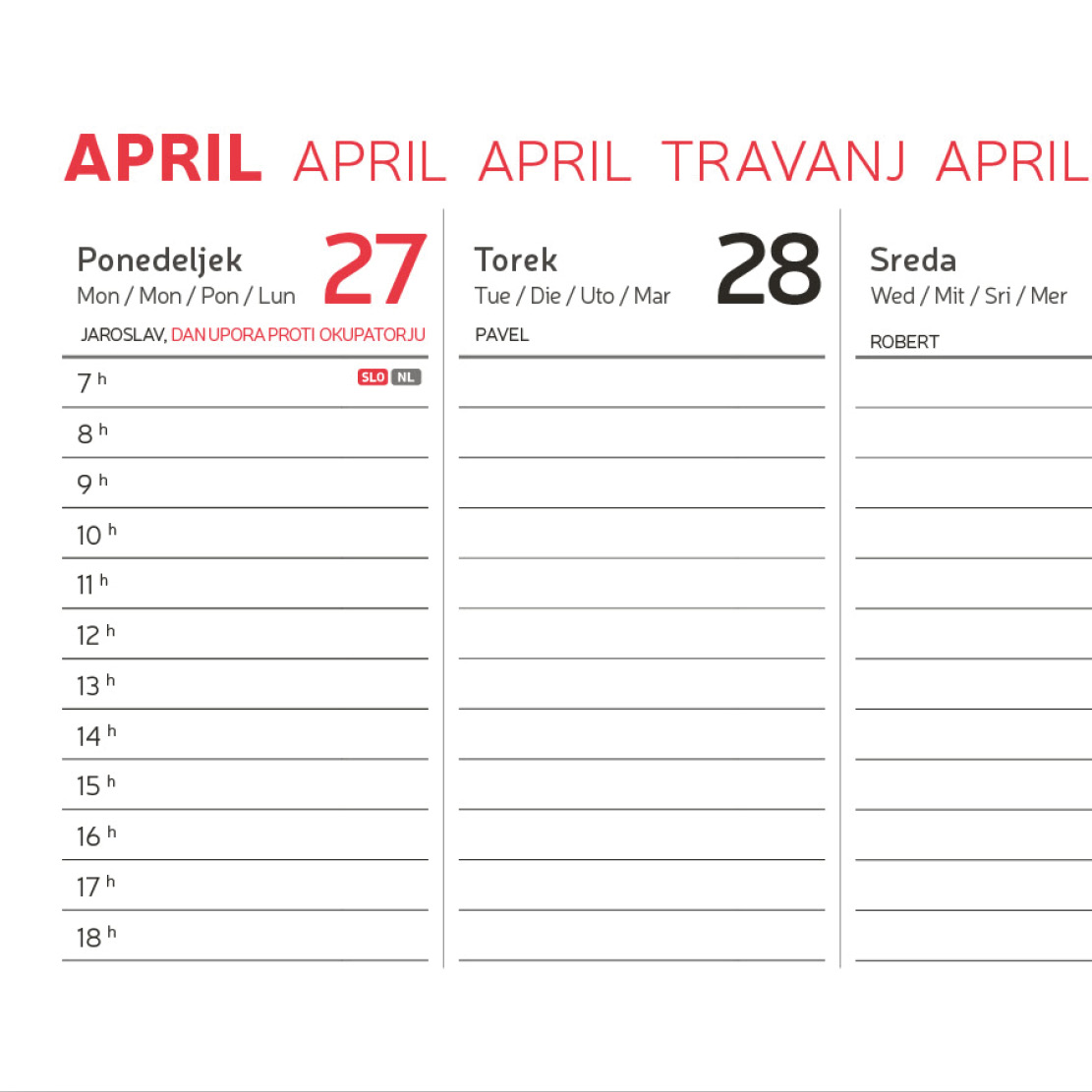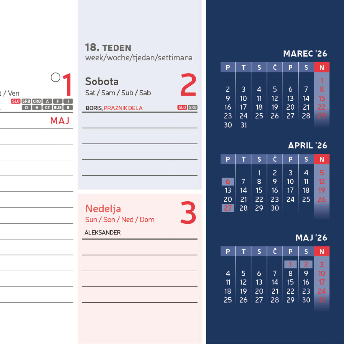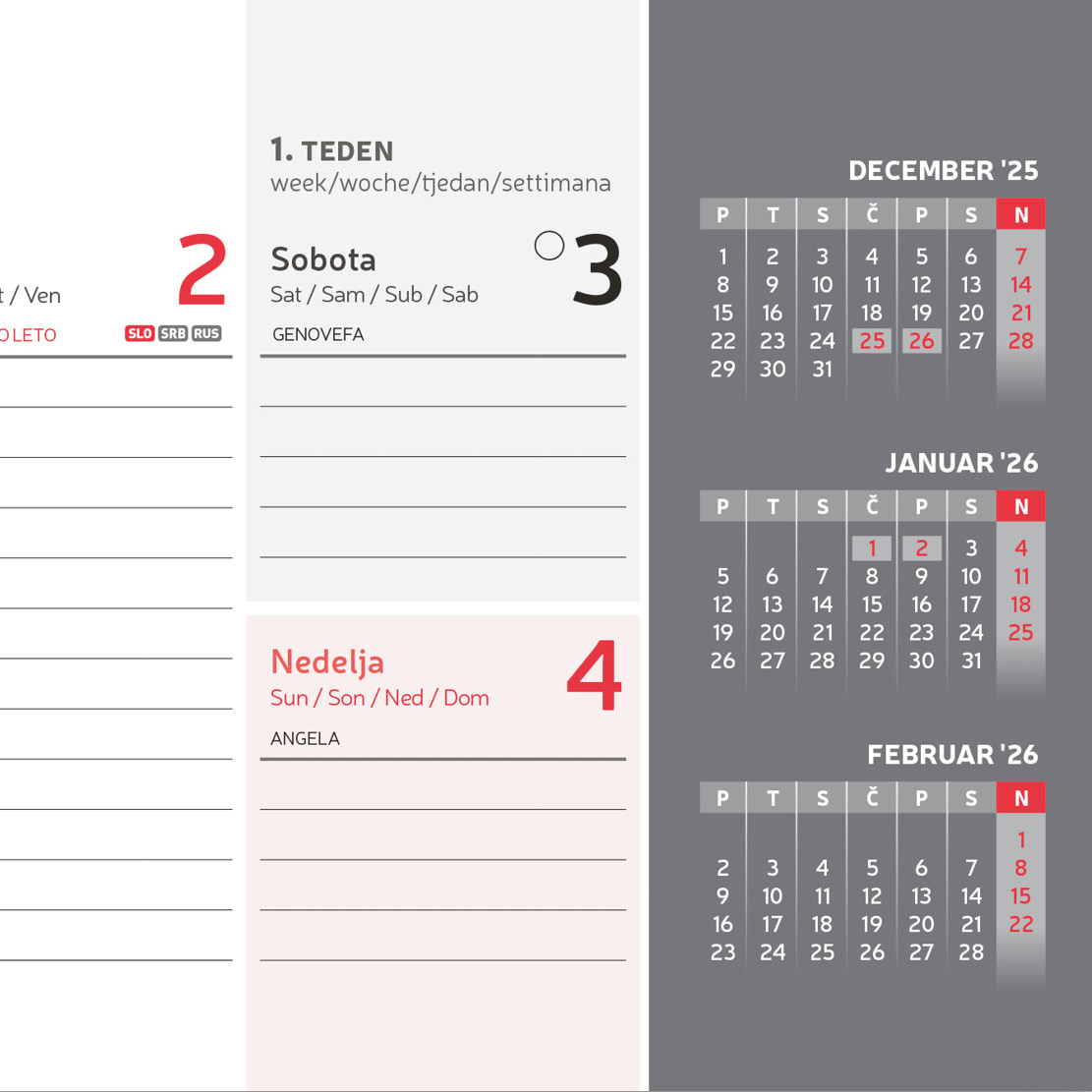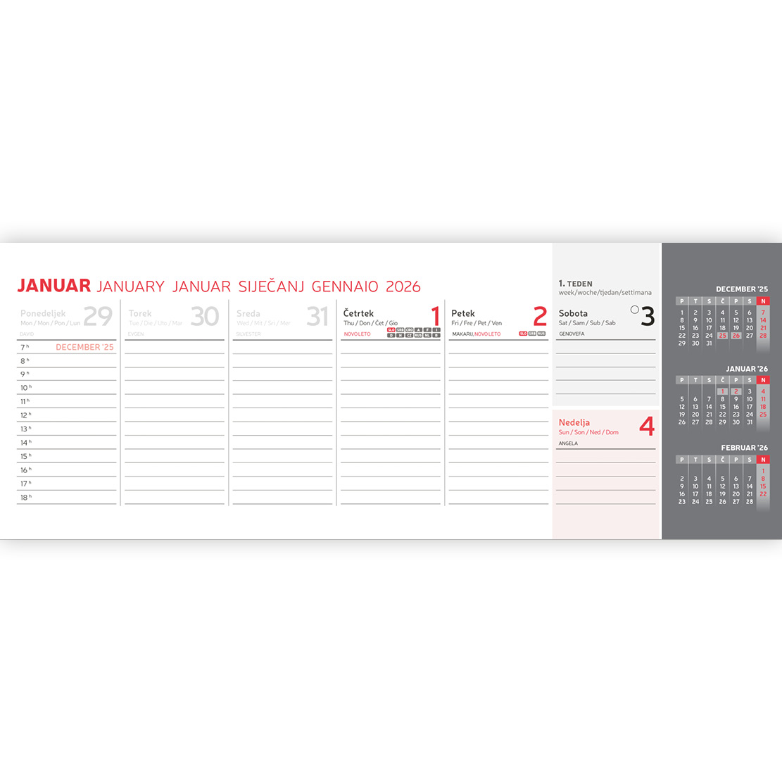56 listov, stojalo iz lepenke (fiksno), 90g brezlesni papir, spiralna vezava, priložena natron vrečka, petjezični (SLO, ANG, NEM, HR, ITA), označeni slov. in tuji prazniki, imena, lune in tedni.