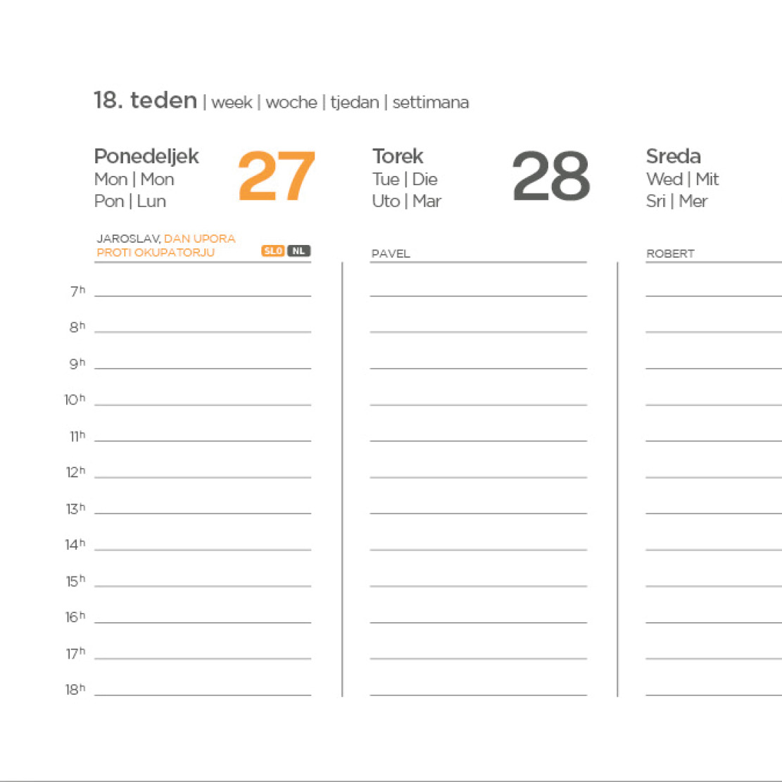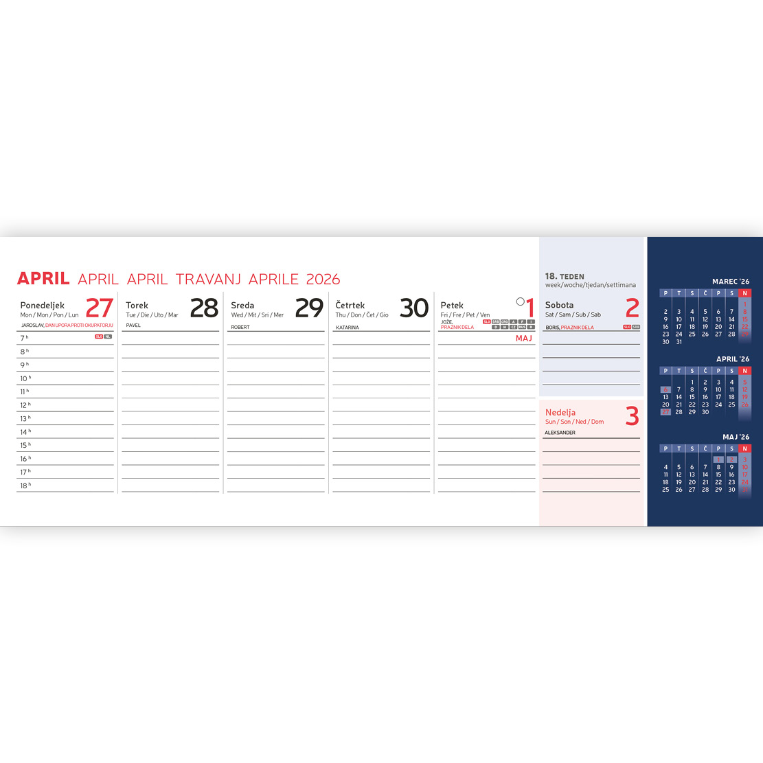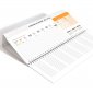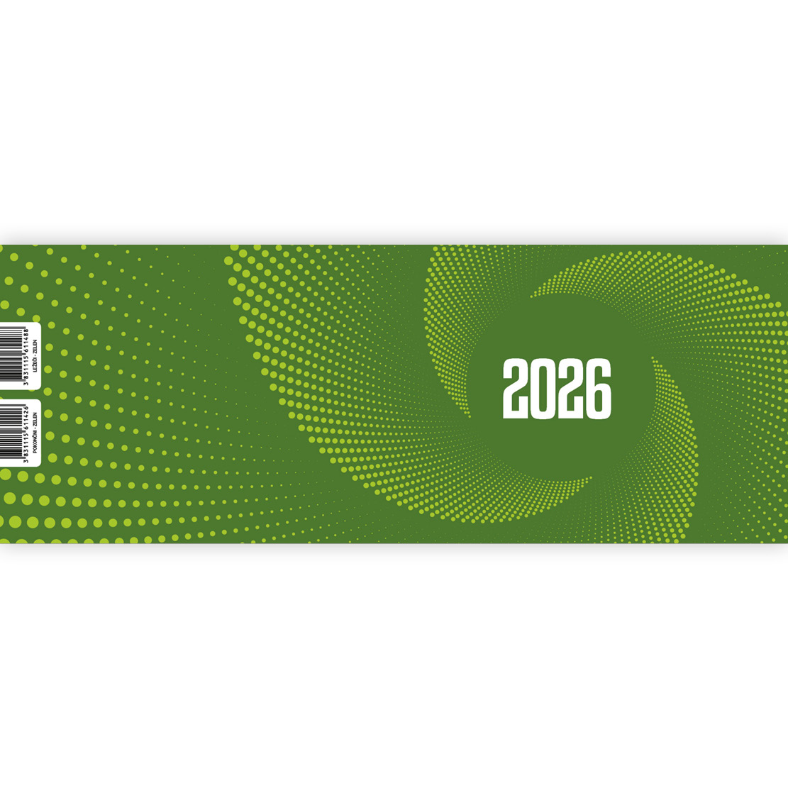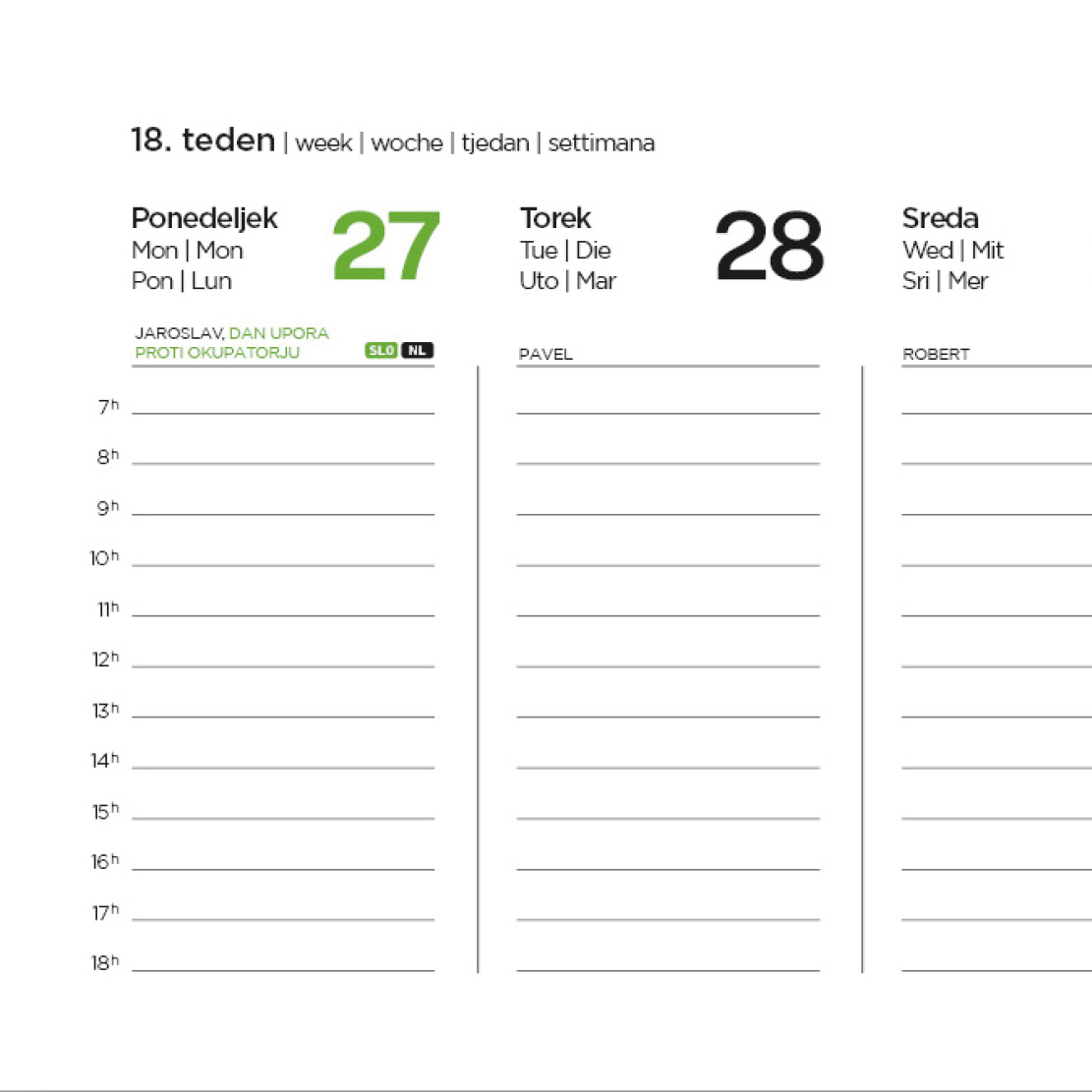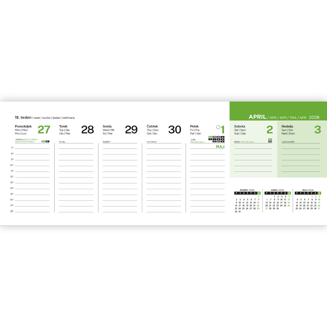 56 listov, stojalo iz lepenke (fiksno), 90g brezlesni papir, spiralna vezava, priložena natron vrečka, petjezični (SLO, ANG, NEM, HR, ITA), označeni slov. in tuji prazniki, imena, lune in tedni.