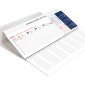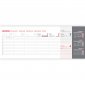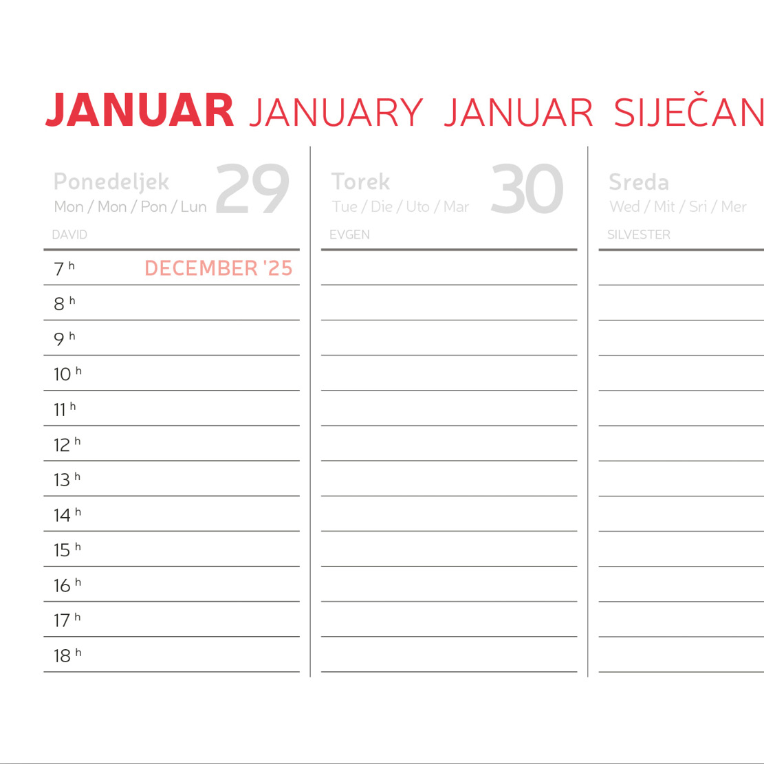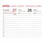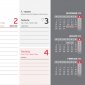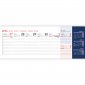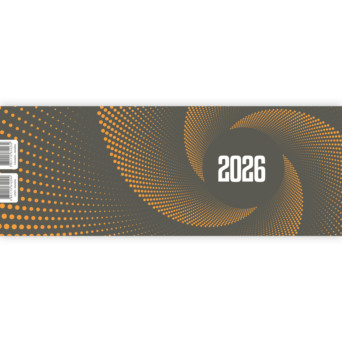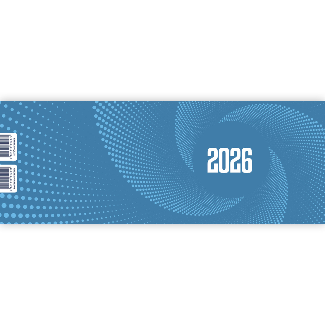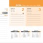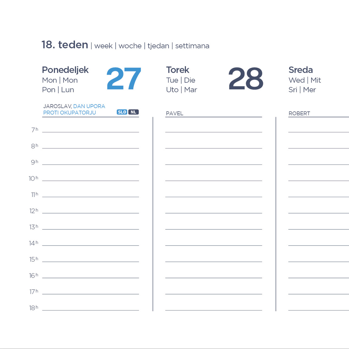 56 listov, stojalo iz lepenke (fiksno), 90g brezlesni papir, spiralna vezava, priložena natron vrečka, petjezični (SLO, ANG, NEM, HR, ITA), označeni slov. in tuji prazniki, imena, lune in tedni.