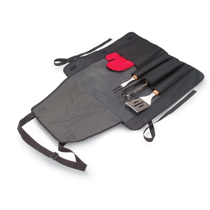 Predpasnik BBQ s tremi različnimi orodji za BBQ in eno rokavico.